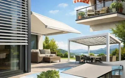 Снижаем перегрев летом и нагрузку на кондиционер. Жалюзи на остеклении, выдвижные маркизы и навесы, перголы с тканью — для офисов с панорамными окнами, кафе и частных террас. Подбираем под ориентацию здания. Москва и область.